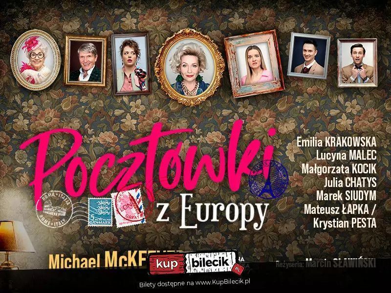 Porzućcie wszelką nadzieję, którzy wchodzicie na widownię, bo "Pocztówki z Europy" to najbardziej absurdalna, zwariowana, bombardująca zwrotami akcji komedia, która wbije was fotel i ani na chwilę nie pozwoli odetchnąć. Bohaterowie przedstawienia to członkowie rodziny mający jedną wspólną cechę - całkowity brak zdrowego rozsądku, który nie przeszkadza im być najbardziej ciepłymi i uroczymi ludźmi, jakich spotkacie. Przecież żadne z nich nie skrzywdzi nawet muchy… No, przynajmniej nie celowo… No, może ewentualnie Babcia… Młody i dobrze sytuowany Artur Sutton (Mateusz Łapka/ Krystian Pesta) wraca do rodzinnego domu po kilku latach podróży po Europie, aby przedstawić rodzinie poznaną w Paryżu piękną Gillian (Aleksandra Radwan/ Karolina Charkiewicz). Młodych z radością witają wytęskniona i kochająca, choć nieco odklejona od rzeczywistości matka (Lucyna Malec) i nie mniej ekscentryczny ojciec (Marek Siudym), który nocami w przydomowym ogrodzie grywa w golfa przy użyciu świecących kul i kija hokejowego. Wszystko wygląda świetnie, rodzinne spotkanie przynosi początkowo dużo radości wszystkim biorącym w nim udział, ale okazuje się, że to tylko pozory sielanki, bowiem na jaw wychodzi kilka niewygodnych faktów z życia rodziny: otóż zmarła rok wcześniej 97-letnia Babcia (Magdalena Wołłejko) żyje i ma się świetnie, ciocia Ester (Małgorzata Kocik) z powodzeniem prowadzi sekstelefon, Artur ma brata bliźniaka o którym dotychczas nie wspominał, a w całym tym bałaganie zapodział się gdzieś pies i zginęła służąca Sheila. No i dom… dom przypomina krzywą wieżę w Pizie. To jednak tylko czubek góry lodowej, bo najważniejsze jest to, czego na pierwszy rzut oka nie widać. Może okazać się bowiem, że ciepła i czarująca atmosfera tego wyjątkowego domu jest tylko fasadą szczelnie chroniącą tą wyjątkową rodzinę przed zbyt bolesną rzeczywistością. Czy powracający do domu syn ma prawo ją zburzyć? Co jest lepsze: życie w trudnej do przyjęcia prawdzie, czy spokój, który przynosi ucieczka od realności? Przekonajcie się sami wyruszając z nami w kolorową i zaskakującą podróż z bohaterami "Pocztówek z Europy".