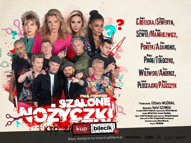 bilety: Szalone nożyczki to niewątpliwy hit wśród sztuk teatralnych... w 1997 wpisano ją do światowej księgi rekordów Guinnessa jako najdłużej bez przerwy graną sztukę na scenach amerykańskich. Autor: Paul Portner Szalone nożyczki - czyli kto zabił artyści: Dorota Chotecka,Karina Seweryn Anna Guzik, Aleksandra Szwed, Artur Pontek, Michał Paszczyk i inniSzalone nożyczki to niewątpliwy hit wśród sztuk teatralnych... w 1997 wpisano ją do światowej księgi rekordów Guinnessa jako najdłużej bez przerwy graną sztukę na scenach amerykańskich. Atrakcyjności tej komedii kryminalnej dodaje fakt, że realizatorzy i wykonawcy zawsze sytuują akcję sztuki w danej chwili, aby widzowie mogli rozpoznawać w przedstawieniu specyfikę swojego miasta, jego instytucje oraz znanych mieszkańców. Dzięki temu publiczność ma okazję, by stać się współwykonawcą naszego spektaklu i pomóc bohaterom w rozwiązywaniu kryminalnej zagadki. Bilety do nabycia na: KupBilecik.pl |